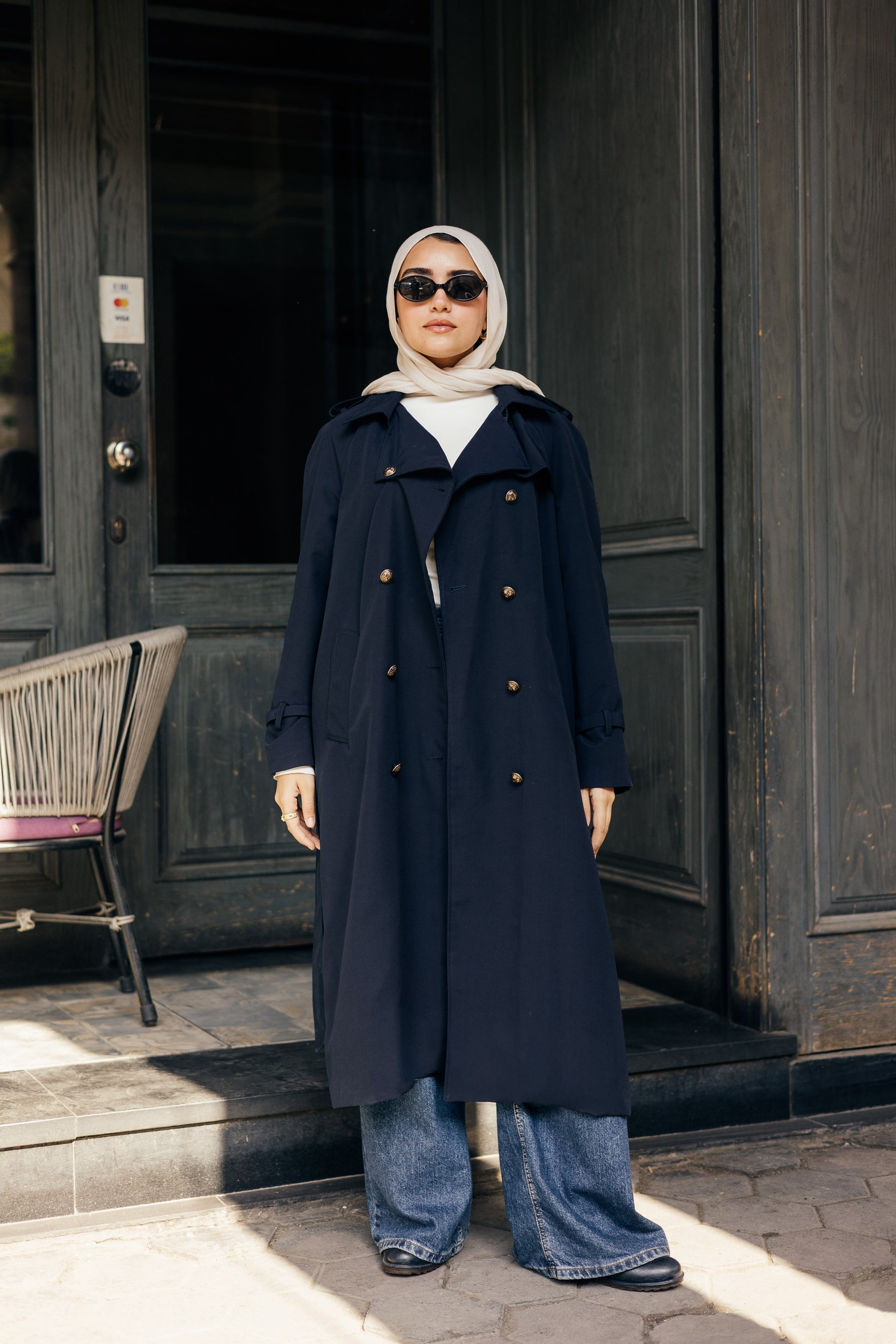 A timeless double-breasted trench coat featuring a waist belt, gold-tone buttons, and a sleek tailored fit for effortless elegance.